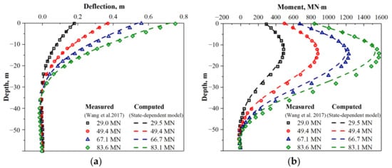 Validation of the numerical model against the centrifuge test reported by Wang et al. [], compared with (a) deflection; (b) moment of the pile.