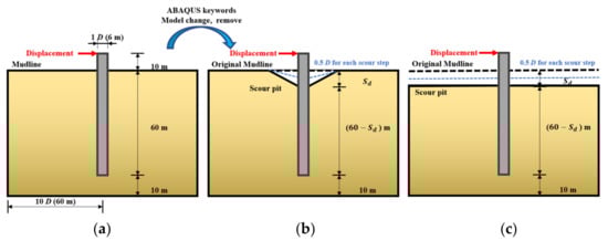 - Defining a special step for the formation of the scour pit. According to the depth of scour in this step, the scour soil is divided into many layers by 0.5 D of each horizon Then, the scour soil is slowly removed by means of adding the keywords in the ABAQUS input file, i.e., Model change, remove as shown in Figure 3b. This operation models the slow unloading process during scouring, and considers the influence of the stress relief;