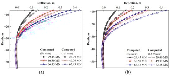 Comparison of pile deflection before and after scouring; (a) ; (b) .