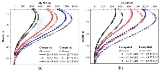 Figure 5a,b exhibits the bending moment changed for two scour depths. As the scour expands the load eccentricity of the pile, Figure 5 displays the variation of the bending moment along the vertical depth for two various scour depths. As shown in the figure, the load lies in the eccentricity of the pile due to the scour expanding. Influenced by the lateral force, the maximum bending moment of and are respectively 18% and 26% higher than that of the original soil. The maximum bending moments along with the rest of the vertical depth increase to 1 m for and 3 m for .
