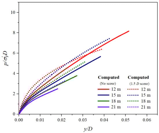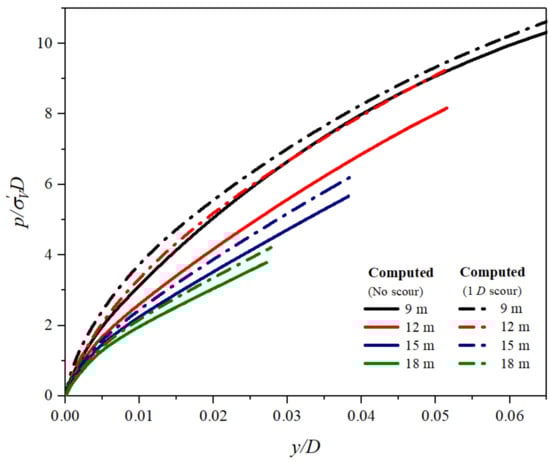 In a view to analyzing the pile-soil reaction of the lateral load, the dimensionless p-y curves at different scour depths are sorted in this research. After the displacement is applied to the pile, head develops to the ultimate deflection of 0.2 D (1.2 m), the dimensionless p-y curves of in the local scour condition in each horizon is slightly stiffer than that at the same depths than original soil in Figure 6. While the dimensionless p-y curve changed in two conditions with the difference of the depth in Figure 7. In the deeper horizon of 13–30 m, the phenomenon is similar to cases, in which resistance is still stiffer than that in the same horizon in original soil. The rigidity enhancement of the remaining interface soil in the deeper horizon becomes more obvious with the rise of scour depth. The stiffer p-y curves resulting from the local scour condition are initially explained by the increase of soil resistance for the remaining soil horizon. The result on Qi’s centrifuge test and 3D simulation indicates that the p–y response at a given soil horizon is just affected by shallow depths and, for most of the profile, the lateral soil stiffness at a given depth below the scour base is greater than that at the same relative depth below the original mudline [,], which is similar to the result of 1 D depth scour in this research.