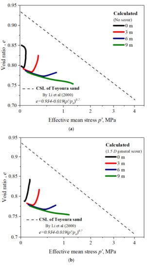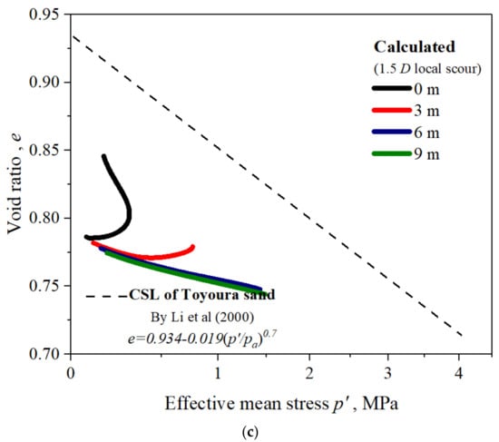 To analyze the characteristics of remaining soil in different scour conditions better, the simulation makes a comparison of three types of soil conditions in Figure 3. This research captures the variation of the stress state of interface soil on the axial compression side. Thus, the research defines the depth calculated from the mudline as the absolute depth , and the depth calculated from the top of the remaining soil as the relative depth . Comparison in different states of sand at the same relative depth can be used to evaluate the characteristics of soil development. The model simulates the lateral loading process of piles in different scour conditions, and then extracts the void ratio and the effective stress at the compressive interface of the pile-soil in e-p’ space in Figure 8. The critical state line (CSL) is collated from the total of 17 shear loading tests accomplished by Verdugo & Ishihara and the critical-state framework is also verified by Li’s state-dependent dilatancy [] which can be used in the constitutive study of Toyoura sand. In e-p’s space, no matter what the initial state of the sand is, it will eventually develop to the critical state line.