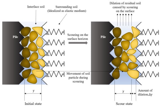 As common models to quantify service capacity between the pile and the surrounding soil [,], the p-y curves can idealize the soil as a series of independent springs around the pile length. Each spring is used to describe the linear or non-linear relationship between the lateral service capacity of the soil (p) and the following lateral deflection of the pile (y) in the given depth. A simplified p-y curve analysis method based on the wedge type of failure in a scour pit condition is innovated []. This wedge analysis method was adopted to evaluate the effects of the scour pit dimension in the sand through this simplified method. On the basis of the subsequent finite element analysis [,], the scour depth influenced most on the lateral pile response than scour width and slope angle of the scour pit, which was similar to Li’s conclusions of centrifuge test [,]. Nevertheless, similar to the excavation effect on pile-soil interaction structure, the removal of soils subjected to scour could be considered as a slow process of unloading []. The lack of remaining soil characteristic analysis makes the existing p-y curves not reasonable and precise enough in the research. During the scour, the stress history of remaining soils changes in the meantime [,], resulting in the state variation of the soil. During the stress state and the normal stress of the remaining soil changed, the dilation of the shear interface brought about a slight rise of the friction angle []. As a result, neglecting the variation of stress state would result in a conservative design when considering the lateral capacity of the pile foundation.