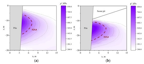 The effective stress contour in the compression side in (a) no scour condition (b) local scour condition.
