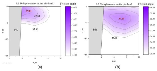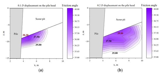 The friction angle contour at the pile head displacement of (a) 0.1 ; (b) 0.2 in local scour condition.