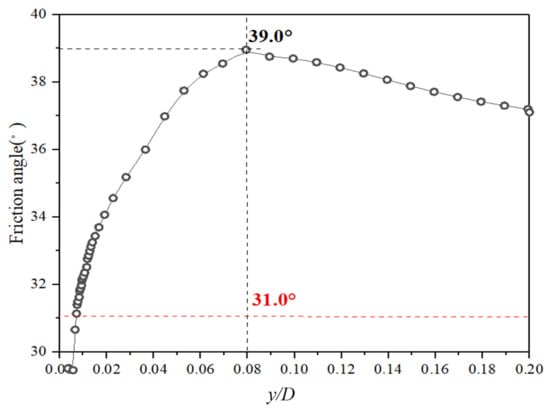 After local scouring, the friction angle reaches its peak at nearly 0.1 pile head displacement. The corresponding friction angle is 31° for original soil in CV triaxial test. Moreover, the dilation angle by simulation is about 8°, and the result is similar to the calculation in Equation (12) as 9.7°. The feasibility of Equation (13) in evaluating dilatancy is proved. The friction angle increases in no scour condition undoubtedly can be explained by the excessive increase in the effective normal stress caused by the extrusion of the surrounding soil. In the post soil extrusion, the curve of friction angle drop in local scour condition can be explained by the failure of sand structure and the stress relief. Besides, the carry limit of soil surface during pile extrusion is also reduced.