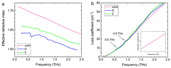 Figure 3 shows the effective refractive index and loss coefficient of two of the 3D printed samples, together with that of the solid PETG material. Note that the refractive index of solid PETG at THz frequencies is higher than in the visible (1.57 at 589.3 nm), as is the case in many materials, due to the contribution of ionic polarizability. Note also that solid PETG has moderately strong THz absorption that rises with frequency following a power law (Figure 3b inset). Strong absorption is caused by the presence of polar components in the PETG molecule, especially the OH and CO groups. The power law dependence of absorption arises from the glassy nature of PETG [49]. There are two significant differences between the solid material and 3D printed samples: in the solid, the refractive index is significantly higher, and the loss coefficient is slightly lower.