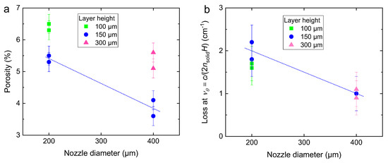 Effects of layer nozzle diameter, together with layer height, on the porosity (a) and diffraction loss (b) in 3D printed PETG samples. Dashed lines are guides to the eye.