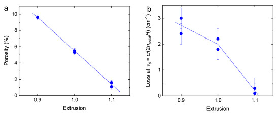 Effects of extrusion on the porosity (a) and diffraction loss (b) in 3D printed PETG samples. Dashed lines are guides to the eye.