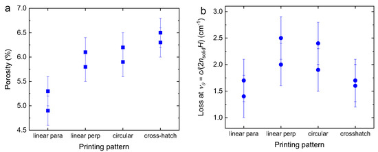 Effects of the printing pattern on the porosity (a) and diffraction loss (b) in 3D printed PETG samples. The labels “linear para” and “linear perp” refer to the linear pattern oriented parallel and perpendicular to the beam polarisation, respectively.