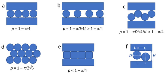 Figure 9a shows a partial cross-section of cross-hatch printed material, where the spacing between the tracks equals their diameter, resulting in dense packing. It is easy to see that the volume fraction of the voids in this case equals p = 1–π/4 = 0.22. (This is much higher than the observed porosity values due to flattening of the real printed tracks: see below.) If the track spacing is either larger or smaller than the track diameter, the packing density is reduced and porosity increases (Figure 9b,c). This explains the observation that there is a “sweet spot” of printer settings, where porosity is minimised. A linear printing pattern can produce a dense hexagonal packing (Figure 9d), where porosity equals p = 1–π/(2√3) = 0.09, explaining why the observed porosity is lower in the linear-printed samples. The model also allows interpretation of the positive correlation between porosity and the diffraction loss peak: Bragg diffraction arises due to variations in the refractive index; these are larger in materials with higher porosity. Finally, Figure 9e depicts a more realistic picture of the 3D-printed structure, showing tracks that are deformed and flattened due to melting. Such deformation fills in the voids, significantly reducing porosity and explaining why the measured values are much lower than those estimated by the model.