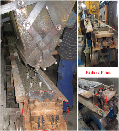 At the cutting and stacking workstation, the molds are overturned and the sleepers are pushed onto a conveyor, where they are separated. Subsequently, the surface and appearance of the product will be inspected. The surface of the sleeper must be well filled out. Isolated cavities with a closed surface up to 100 mm2 and a depth up to 5 mm are permitted. Fragments on edges and surfaces are not permitted in places where they could interfere with the fastening function. The load-bearing surface of the sleeper (the surface that is in contact with the fastening) must be undamaged. The reinforcement must not protrude more than 8 mm from the sleeper front. The absence of longitudinal wire from the reinforcement or twisting of the wires is not allowed. The sleeper mold and failure point are shown in the Figure 1.