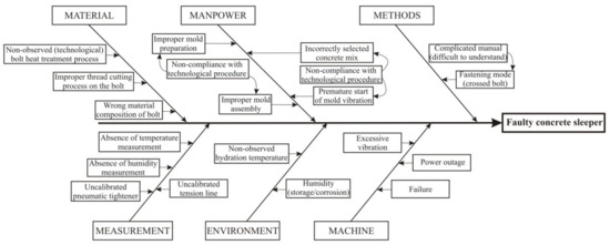 As can be seen in Figure 2, the ribs have been modified according to actual problems of the process of sleeper production (Measurement, Materials, Methods, Environment, Manpower, Machine). The whole diagram was not used to construct the Pareto diagram; rather, only the most numerous, and especially measurable, causes were taken into account.