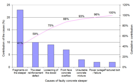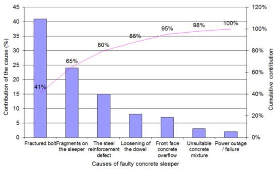Pareto diagram—contribution of causes of faulty concrete sleepers.