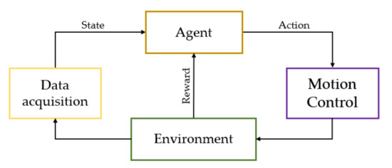 - Kober, J.; Bagnell, J.A.; Peters, J. Reinforcement learning in robotics: A survey. Int. J. Robot. Res. 2013, 32, 1238–1274. [Google Scholar] [CrossRef] [Green Version]