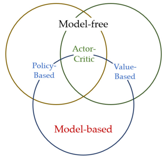 As illustrated in Figure 5, the most commonly applied DRL algorithms can be grouped into model-free and model-based methods. Model-based methods have access to the environment transition dynamics, which is either given or learned from experience. Even though the model-based approaches are more sample efficient, they are limited to the exact or approximate models of the environment. Thus, accurate models are rarely available and often are difficult to learn. Model-free methods, however, learn control policies without building or having access to a model. The ability to provide an optimal control sequence without the use of a model can be advantageous in dynamically complex environments, which is mostly the case in the context of industrial robot control. However, model-free approaches can require a large amount of learning data [67]. To overcome this issue, benefits of combining model-based and model-free methods have been explored in [68]. Both types can be divided into two categories based on the learning approach: policy-based learning and value-based learning [69]. These methods can also be combined, which results in an actor-critic approach [70].