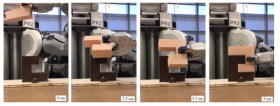 Similarly, as in computer-vision based control, most of the attention in the DRL case is focused on the grasping process. However, the majority of real-world tasks require not only accurate grasping but also precise object placement. Apart from a simple stacking task that could be used in the palletization process [86], a widely used process after grasping is an assembly task. In [87], a method of learning to assemble objects specified in CAD files was proposed. Whereas the CAD data were utilized to compute a geometric motion plan used as a reference trajectory in U shape assembly—Figure 8, gear assembly and peg insertion tasks. In similar settings, Reference [88] incorporated force/torque information for an assembly task of rigid bodies.