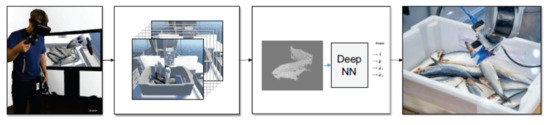- Dyrstad, J.S.; Øye, E.R.; Stahl, A.; Mathiassen, J.R. Teaching a robot to grasp real fish by imitation learning from a human supervisor in virtual reality. In Proceedings of the 2018 IEEE/RSJ International Conference on Intelligent Robots and Systems (IROS), Madrid, Spain, 1–5 October 2018; pp. 7185–7192. [Google Scholar]