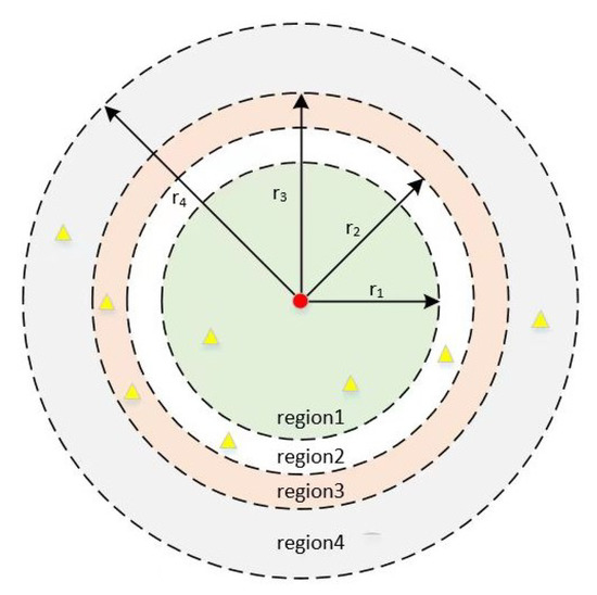 Schematic of shooting reward. We take the target point as the center of the circle, and according to the SDR evaluation index of the data, we divide four regions with the radii of 2.0 mm, 2.5 mm, 3.0 mm, and 4.0 mm. The red points represent the ground truth, and the yellow points represent the landmarks predicted by the model. The predicted landmarks fall into different regions to give them different rewards.