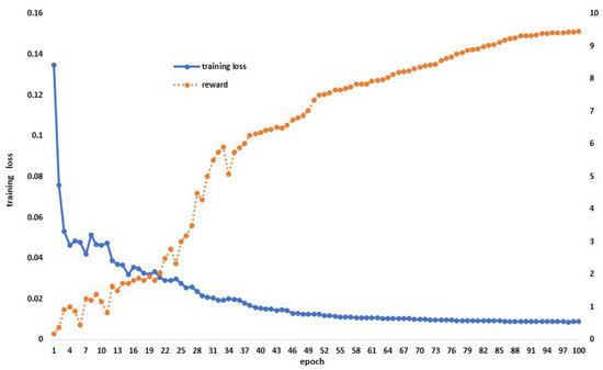 All of our experiments were completed on an NVIDIA RTX 3090 GPU and were performed in Pytorch 1.8.0. A setup of 300 epochs was selected for the search neural network architecture task, and 300 epochs were set for neural network training. The training network and the search neural network design both have a batch size of two. We used the ADAM optimizer for both search and training throughout the process. Additionally, the maximum validation accuracy of the previous five epochs is the shooting reward utilized to update the NAS controller. During model training, we use the loss function to optimize the gradient and use the shooting reward to show the training accuracy of the model, as shown in Figure 4.