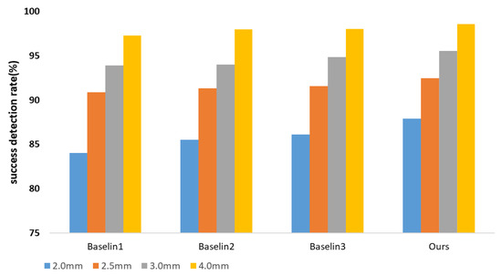 Ablation study of our model. Success detection rates (SDRs) using four precision ranges, including 2 mm, 2.5 mm, 3 mm, and 4 mm, with 150 test images.