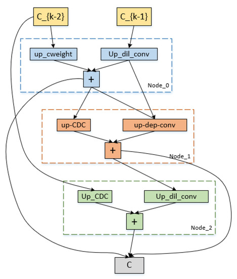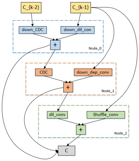 The down-sampling and up-sampling cells that were searched using our approach are represented in Figure 7 and Figure 8. Each cell in the figures has three intermediate nodes, each of which has two operations performed out from the preceding nodes. The nodes correspond to feature maps for each cell. Our proposed reward, which receives the maximum reward during the search optimization epochs, determines which cell structure is selected. Figure 7 and Figure 8 demonstrate that the CDC operation is preferable in our search space by the search processing. In order to provide more accurate high-level semantic information and details of the gradient level between the down-sampling and up-sampling routes, the CDC procedure complements the conventional convolution operation.