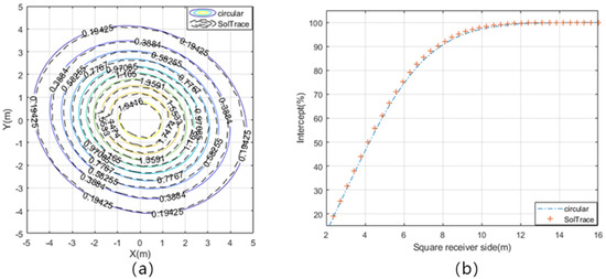 - The circular Gaussian model simplified by the elliptic Gaussian model was compared with SolTrace. Under the condition that the reflected light intensity distribution was consistent, the flux density distribution and intercept factor obtained by the circular Gaussian model were consistent with SolTrace. The absolute differences were only 0.64% and 0.58%. However, the present model has a lower prediction ability than the SolTrace.