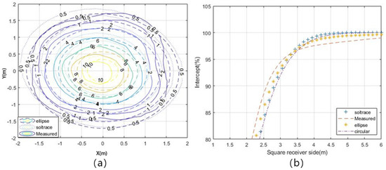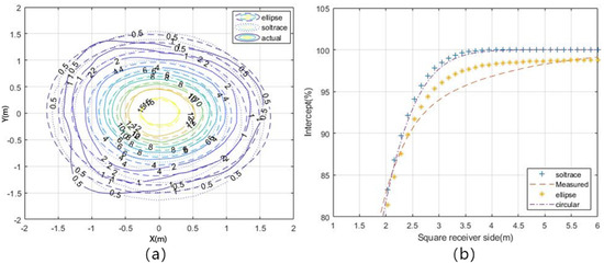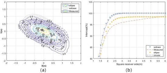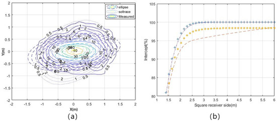 - Comparing the elliptic Gaussian model with the experimental data, the results of the elliptic Gaussian model are better than SolTrace and indirect integration. The distribution of the flux density is consistent with the experimental data, and the curvature variation in the intercept factor is closer to the experimental data. The average difference in flux density distribution is 2.83%, the minimum difference is 2.33%, and the maximum difference is 3.64%; the average difference in the intercept factor is 1.30%, the minimum difference is 0.46%, and the maximum difference is 2.30%.