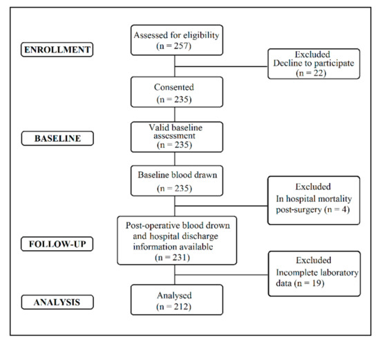 The eligible patients undergoing elective CABG surgery (n = 257) were consecutively recruited at the Department of Cardiac Surgery, UHC Zagreb, Croatia, between December 2014 and March 2016. A flow chart displaying the recruitment and retention of participants through the present study is shown in Figure 1. Eligibility criteria included patients undergoing elective CABG surgery who were 18 years of age or older and could complete questionnaires in the Croatian language. CABG procedures encompass both on-pump and off-pump surgical procedures. Patients who were unwilling to participate (n = 22) were excluded from the study. Some patients (n = 4) died within three days of surgery and were excluded from the study due to a lack of postoperative data. Patients missing some laboratory data were also noted (n = 19) and excluded from the study.