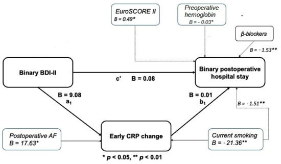 The mediation models were performed to illustrate to the extent to which patients’ postoperative hospital LOS (dependent outcome variable) related to their BDI-II depressive symptom scores (independent, predictor variable) and whether the relationship was mediated by early and persistent postoperative CRP changes (mediator variables) or if patients’ postoperative early (1–3 days postoperatively) and persistent (4–6 days post-operatively) CRP changes affected the relationship between their BDI-II depression symptom score and the postoperative hospital LOS. In Figure 2 and Figure 3, pathway c’ represents the direct effect of the BDI-II score on postoperative hospital LOS after controlling for mediators, while pathway a1b1 represents the total indirect pathway of the mediators. Both the direct and indirect pathways in the presented models were non-significant. This indicates the lack of association of the BDI-II depression score with the length of postoperative hospital LOS and the non-existence of the mediation role of postoperative CRP levels. Nevertheless, a higher persistent CRP change (Figure 3) was proven as a significant predictor of postoperative hospital LOS in both mediation models as presented. As shown in Figure 2 and Figure 3, significant contributors to early and persistent CRP response were smoking status and postoperative atrial fibrillation and, in the case of persistent CRP change, concomitant (post)operative infection.