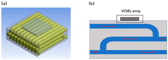 Vafai pointed out that one disadvantage of monolayer microchannels was the high and uneven temperature distribution along the channel direction. It is because the flow rate of the coolant is relatively low, and large amount of heat generated by the chip cannot be dissipated, resulting in a temperature gradient that causes thermal stress inside the VCSEL chip. High local thermal stress is a major cause of chip failure. One way to reduce the temperature gradient is to increase the flow of coolant. Therefore, in the study, we designed a double-layer reflow microchannel with dual inlets. As shown in Figure 2, the liquid flows in the two adjacent layers of the heat sink were in opposite directions, as shown by the arrow in Figure 2b, and the upper channel is dissipated through the lower channel for secondary heat dissipation, thereby achieving uniform heat dissipation to the chip.