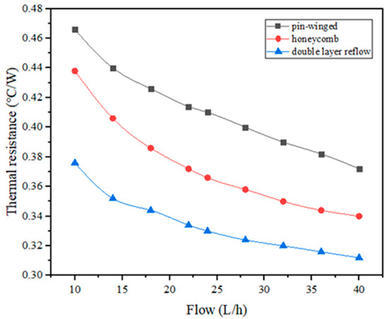 It can be seen from Figure 6 that the three thermal resistance curves varying with coolant flow were approximately parallel, and the thermal resistance decreased with the increase of coolant flow, The corresponding chip thermal resistance of honeycomb, pin fin and double-layer reflux heat sink decreased from 0.439 °C/W, 0.466 °C/W and 0.376 °C/W at 10 L/h to 0.340 °C/W, 0.376 °C/W, and 0.312 °C/W at 40 L/h, respectively. However, with the increase of coolant flow to 22 L/h, the decreasing trend of thermal resistance gradually leveled off, and continuously increasing the coolant flow rate will cause the pressure of the pipe in the microchannel to rise, so the coolant flow rate cannot be increased indefinitely.