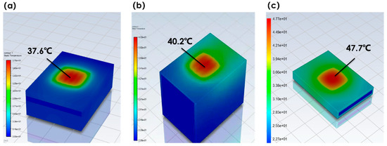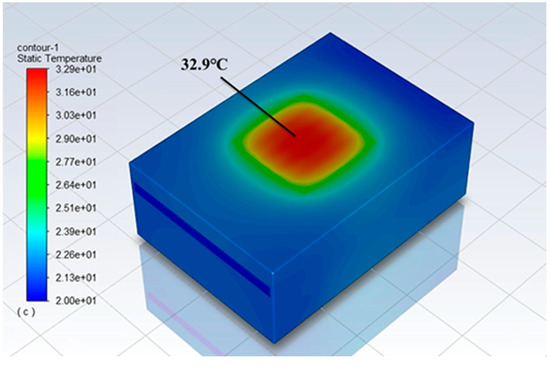 According to the above analysis, the optimal design of the three microchannel radiator structures is double-layer backflow, and the optimal parameters are as follows: Hydraulic diameter of the microchannel is 0.5 mm, flow rate of the cooling medium is 24 L/h, inner wall roughness is 0–20 μm, and the thermal resistance of the chip is 0.256 ℃/W. The temperature cloud diagram is shown in Figure 12.