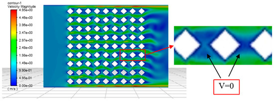 Figure 7 shows the temperature nephogram of the heat source surface of the microchannel heat sink with three structures when the cooling working flow rate was 14 L/h. The maximum chip temperatures were 37.6 °C, 40.2 °C, and 47.7 °C on the dual-layer reflow, honeycomb, and pin-fin microchannel heat sinks, respectively. By simulating the flow velocity cloud in the channel of the pin-finned radiator, the highest temperature at its heat source surface might be analyzed because the pin-fin can change the flow state of the cooling mass and enhance the turbulent flow state of the cooling mass for enhanced heat transfer, but there was no water passing through the dead space behind the needle fin, and the cooling mass is prone to large cavities (shown in Figure 8), and these cavities significantly reduce the heat dissipation capacity. The reason for the best heat dissipation effect of the double-layer return microchannel radiator may be that the two water inlets provided by the adjacent bi-directional flow channels increase the flow of cooling mass while achieving secondary cooling of the lower channel to the upper channel. The combined thermal resistance and temperature results show that the double-layer return microchannel heat sink had the best thermal performance among the three structural designs.