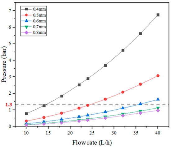 It can be seen from Figure 9 that with the decrease of the hydraulic diameter of the microchannel, the thermal resistance of the chip gradually decreased, and with the increase of the coolant flow rate, the thermal resistance of the chip under the conditions of different hydraulic diameters of the microchannel presented an approximately parallel downward trend, and the downward trend was slowing down. The results show that the smaller the hydraulic diameter of the microchannel, the better the heat dissipation effect of the chip. For example, when the coolant flow rate was 14 L/h, the hydraulic diameter of the microchannel was 0.4 mm compared to 0.8 mm, and the thermal resistance of the chip was 73.3% of the latter. However, the hydraulic diameter of the microchannel cannot be reduced indefinitely. The microchannel heat sink is sensitive to pipeline pressure. Large pipeline pressure may damage the microchannel structure, thus causing channel blockage [19]. Therefore, the variation of microchannel pipe pressure with coolant flow rate was simulated for different hydraulic diameters, and the curves are shown in Figure 10. In the double-layer reflow microchannel heat sink, the pipeline pressure increased greatly with the decrease of the hydraulic diameter, and it showed an obvious upward trend with the increase of the coolant flow rate. According to research, 1.3 bar was a relatively safe pipeline pressure threshold. It can be seen that when the hydraulic diameter is 0.4 mm, the coolant flow rate to keep the pressure in the pipeline lower than 1.3 bar was 10 L/h and 14 L/h, when the hydraulic diameter was 0.5 mm, the cooling mass flow rate of 10 L/h, 14 L/h, 18 L/h, 22 L/h, and 24 L/h could meet the requirements. When the hydraulic diameter was greater than 0.7 mm, the coolant flow rate was in the range of 10 L/h–40 L/h, and the pressure of the pipes in the microchannel was less than 1.3 bar.
