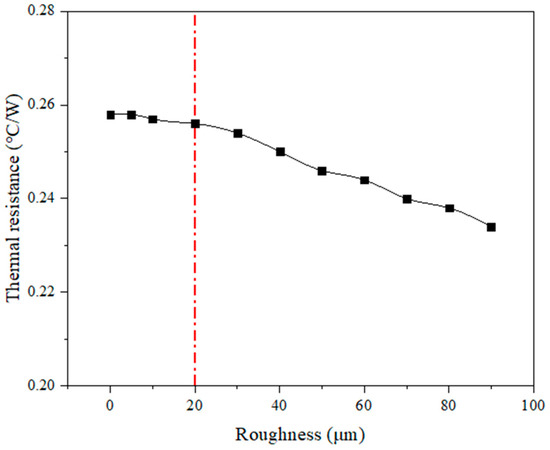 Figure 11 shows the influence curve of the inner wall roughness of the microchannel on the thermal resistance of the chip. It can be seen that when the channel wall roughness was 0–20 μm, the thermal resistance of the chip did not change significantly and only decreased from 0.258 °C/W to 0.256 °C/W. However, when the microchannel wall roughness exceeded 20 μm, the curve dropped slowly from 0.256 °C/W at 20 μm to 0.234 °C/W at 90 μm with a decrease of 8%. The result shows that the increase in channel wall roughness could reduce the thermal resistance of the chip. The reason might be when the roughness was small, the heat exchange area and the flow state of the cooling mass did not change significantly compared with the smooth wall surface. With the increase of micro-channel wall roughness, on the one hand, the heat transfer area between the cooling medium and heat sink is increased, on the other hand, the degree of disturbance and turbulence of the cooling medium is increased, and the heat dissipation effect was enhanced. However, the roughness continued to increase, which means that the surface grain was less constrained, and the surface was prone to plastic deformation [20], which is easy to cause pipeline blockage caused by erosion and corrosion of the cooling medium, affecting the service life of the microchannel heat sink.