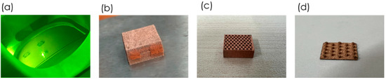 Although the microchannel water-cooled heat sink obtains obvious advantages, limited by the high difficulty of precision machining of microchannels, the application of microchannel water-cooling technology in the field of VCSEL chip cooling is not mature yet. At present, the microchannel heat sink is usually produced by using plasma etching technology to etch different hollow structures on multi-layer high thermal conductivity rectangular sheets, respectively, then, through hot press welding technology for precision welding. However, the multi-layer welding will also introduce additional thermal resistance, which will reduce the mechanical strength and service life of the heat sink manufactured by hot-press welding. For this situation, it is urgent to introduce a new technology to break through the current technological bottleneck. Laser 3D printing technology is an additive manufacturing technology based on the idea of near-net forming [12,13,14], which uses laser as the energy source to scan the metal powder bed layer by layer according to the planned path in the 3D CAD slice model, and the scanned metal powder is melted and solidified to achieve metallurgical bonding and finally obtain the metal parts of the model design. 3D printing technology has the characteristics of flexible design and high degree of freedom for complex structures. Compared with the traditional laminated soldering technology, 3D printing one-piece formed channel structure avoids the additional thermal resistance introduced by multi-layer pressed soldering and the risk of solder diffusion into the microchannel blocking the channel. Therefore, the use of 3D printing technology to prepare microchannel heat sinks is expected to drive a significant development in chip thermal management. In 2011, the Fraunhofer Institute in Germany fabricated a steel, titanium, and aluminum alloy heat exchanger for automobiles by 3D printing technology. The experimental results show that 3D printing technology increases the possibility of complex and precise design fabrication [15]. In 2019, the University of Nottingham proposed a method to fabricate pure copper under a low-power small laser spot diameter 3D printing device and obtained parts with a high density of 85.8% and high electrical conductivity [16], providing a research idea to fabricate pure copper parts under a low-power device. In 2021, a topologically bionic pure copper microchannel heat sink was fabricated by 3D printing of fused wire fabrication at Texas State University, providing a new way to manufacture heat sinks [17]. Yao et al. studied the preparation of single-layer diamond-shaped fork-row microchannel heat sink using laser 3D printing technology to dissipate heat for a chip with a heat flux of 60 W/cm2. The results show that the maximum temperature of the heat source surface is 75.62 °C, and the experimental results are in good agreement with the simulation results. This work can provide a comparative reference for the development of our research [18].