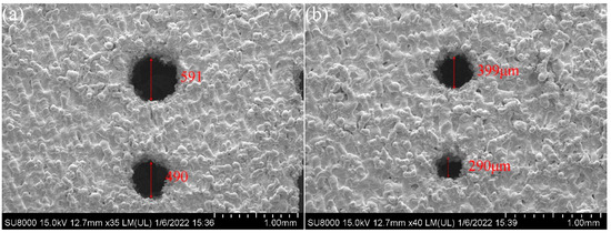Figure 15 shows the scanning electron microscope (SEM) images of microchannels designed with diameters of 600, 500, 400, and 300 μm formed by laser 3D printing. The deviation between the actual size and the design value was in the range of −10 um and −1 um. The reason for this dimensional deviation might be that copper has excellent thermal conductivity, and during the printing process, the high temperature formed in the melt pool after laser incidence was rapidly conducted, and under high-speed cooling conditions, copper’s shrink caused the actual size of the channel to be smaller than the design size. Therefore, it is important to study the effect of microchannel dimensional accuracy on the performance of heat sink. In this study, the microchannel diameter was 0.5 mm with a dimensional accuracy of 20 μm, at which the maximum temperature on the chip was reduced by 0.1 °C compared to the theoretical value as shown in Figure 16. It can be seen that the roughness and dimensional accuracy of 3D printed microchannels have a certain enhancement effect on the device’s thermal performance and help to reduce the chip’s thermal resistance.