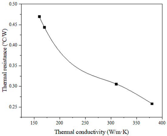 Material thermal conductivity is the most critical factor affecting the thermal performance of microchannel heat sink. In this study, the heat treatment process of heating at 1000 °C for 12 h was used to modify the property of copper specimens formed by 3D printing. Compared with that before heat treatment, the thermal conductivity of the material increased from 160 W/m·K to 310 W/m·K, with a performance improvement of 93%, and this thermal conductivity value was similar to that in the literature [21]. Heat treatment can make incompletely melted particles reach a molten state to form neck connections and promote densification [19]. Figure 17 compares the variation curve of the thermal resistance of the chip with the thermal conductivity of the radiator material. When the thermal conductivity of the radiator material is 160 W/m·K, the thermal resistance of the chip is 0.47 °C/W. When the thermal conductivity of the heat sink material is 310 W/m·K, the thermal resistance of the chip is 0.306 °C/W, and the maximum temperature of the chip surface is 35.3 °C, which can fully meet the operating temperature range of the chip (−45 °C~80 °C).