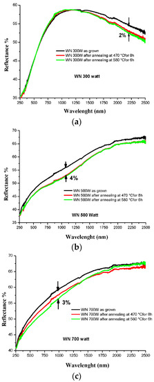 UV–VIS–NIR reflectance of (a) 300 W, (b) 500 W, (c) 700 W.