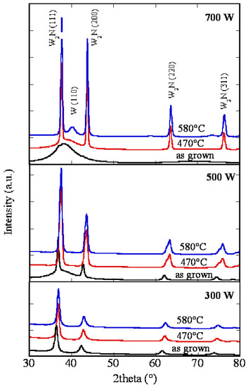 The X-ray diffraction peaks of reactively sputtered tungsten nitride, WNx produced at different deposition powers are shown in Figure 3. Phases of the WNx films before and after annealing at 470 °C and 580 °C were analyzed.
