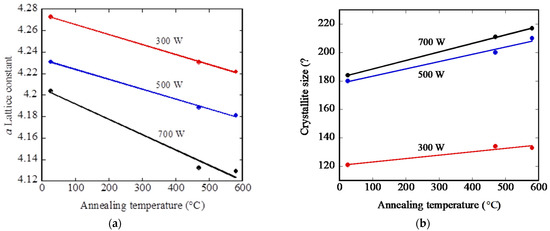 Only a slight change of crystallite size was observed when the annealing temperature was increased for each analyzed deposition power.