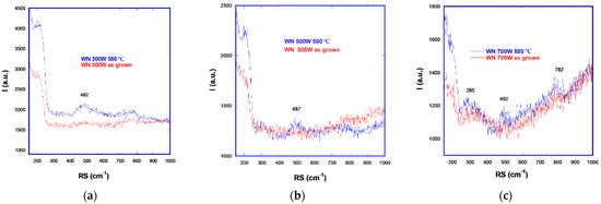 Micro-Raman before (red line) and after (blue line) annealing at 580 °C for 300 W (a), 500 W (b), 700 W (c).