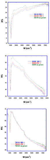 As can be seen from the 700 W spectrum, after annealing there was a band at 270-280 cm−1 RS that can be attributed to W-O bending, and a band at 780 cm−1 that can be attributed to the W-O-W bonds stretching [21]. The presence of such bands, indicative of an oxide phase, could be due to the presence of a tungsten phase originating from disproportion, as already discussed in relation to the XRD results. Metallic nanoparticles oxidize easily. Figure 8 presents a comparison of FTIR reflectance before and after the two annealing steps for all films. The R% decrease is markedly more pronounced in the 500 W and 300 W samples that in the 700 W one.