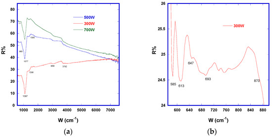(a) FTIR Reflectance comparison; (b) 300 W FTIR inset with evidenced signals.