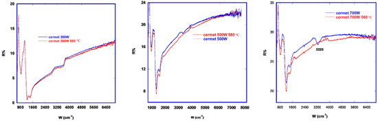 Another aspect of the evolution of tungsten nitrides after annealing can be observed when they are part of cermet materials (e.g., with AlN as the ceramic part in absorbing layers of the patented solar double nitride coatings described above [4]). For fabricating a AlN–WN cermet, AlN material (cermet matrix) was produced at a constant cathode power, while WNx phases dispersed in the matrix were produced by varying the cathode power (with a power value decreasing in a stepwise manner for each layer. When created in this way, a graded cermet has a high metallic content at the start and a low metallic content at the end of process. As for single materials, the same applies as for cermet and the nitridation stage of metallic W influences its stability: barely nitridated materials (700 W) after annealing can dismutate into W and W2N, while an excess of nitrogen (300 W) undergoes crystalline readjustment with nitrogen release. For the purpose of verifying their stability inside the cermet, thin films of cermet nitrides deposited at the same three representative powers (700 W, 500 W and 300 W) were characterized by means of vibrational analysis before and after annealing. First of all, FTIR reflectance (Figure 10) was found to depend on metallic content; in fact, cermet 700 W had the higher FTIR reflectance and cermet 300 W the lower FTIR reflectance.