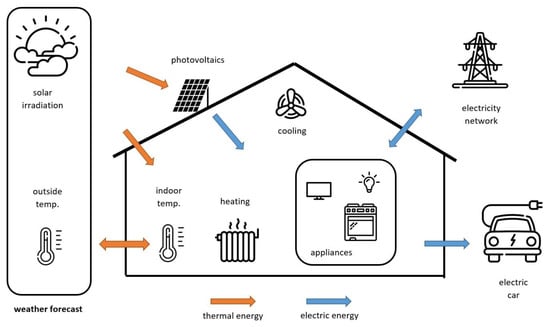 The model consisted of kitchen appliances, a washing machine, a TV, a PC, and lighting fixtures. These appliances were described by their power consumption and timing during the week. The more complicated parts of the model were the heating and cooling, which were described by the energy balance with regard to the indoor desired temperature, the outside temperature, and the accumulation of energy. Another main subsystem of the model is the weather forecast. It was used to obtain the expected outside temperature and cloudiness. Cloudiness was used to create variation in the forecasted solar irradiance. Solar irradiance was also used to predict the power generation from the photovoltaic system, which then served in the energy balance calculation of the whole building. The amount of money that would be expected to be paid according to the forecast horizon was calculated from this energy balance and the prices for buying and selling the energy from and to the grid. Lastly, there is a battery subsystem for the charging of an electric vehicle. The parameters used are estimates of the expected values based on experience with similar thermal systems. The sensitivity of the predictions to model parameters was not been investigated in this paper.