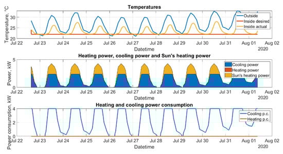 Secondly, the model contains electric heating and cooling systems that most affect the overall power consumption. Predominantly, the outside temperature and the heating effect of solar irradiation forecasts have the biggest effect on indoor temperature. The heating system respects the demands of the user by keeping the desired temperature.
