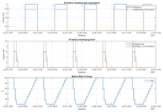 The first part of Figure 3 and Figure 4 shows the overall predicted power consumption of the home and the predicted power generation from the photovoltaic panels. By combining both terms, the overall power consumption of the home is lowered by the power generated by the photovoltaic panels, as shown by the energy balance on the second graph. The surplus of generated energy results in the possibility of selling it back to the grid. These results were obtained for two different areas covered by photovoltaic panels-namely 10 m2 and 30 m2.