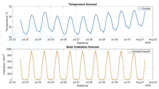 For the irradiation forecast, a system from the European Union Science Hub called PVGIS (Photovoltaic Geographical Information System) was used [36]. It contains historical data on irradiation in different areas around the world measured for several years. The monthly irradiation data show a typical day’s irradiation of a given month for a given place. In this case, Palermo (Italy) was chosen as the city of interest. Such an irradiation profile was then recalculated based on the expected cloudiness in the upcoming days by: